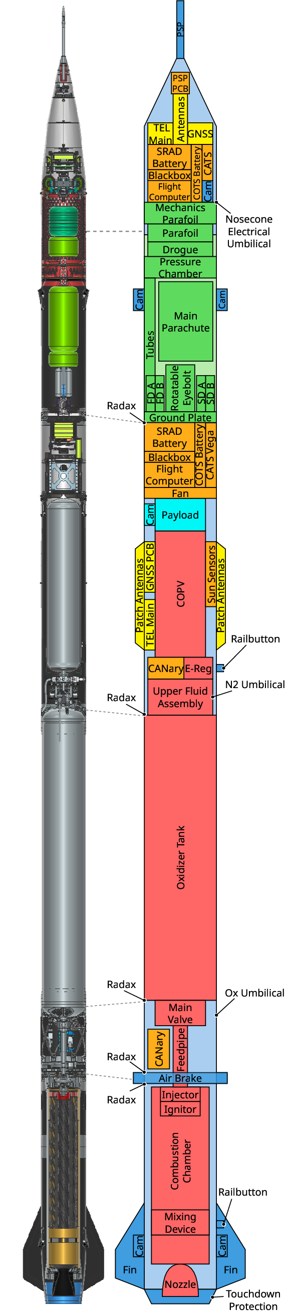 The aerostructure is optimized for strength-to-weight, using CFRP and GFRP composites depending on RF-transparency requirements. An integrated air brake system provides active apogee targeting, while a dedicated pitot-static probe enables real-time airspeed and altitude measurements.