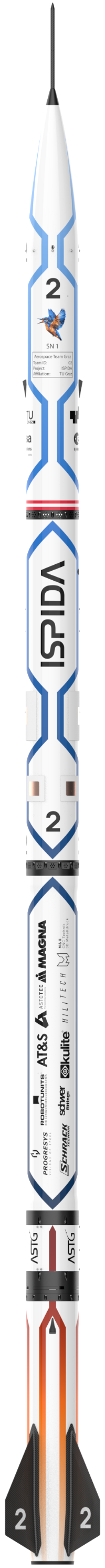 Building on the success of HALCYON and ALCEDO, ISPIDA features our latest hybrid rocket engine. Named after the European kingfisher, the supersonic rocket reached an altitude of 9368m at the European Rocketry Challenge 2025. By performing flawless operations, we could secure the H9 Flight Award and the prestigious overall ranking EuRoC Award.